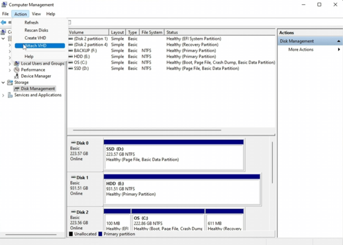 - Im Fenster Festplattenverwaltung klicken Sie in der oberen Menüleiste auf Aktion und wählen Sie dann VHD anhängen.