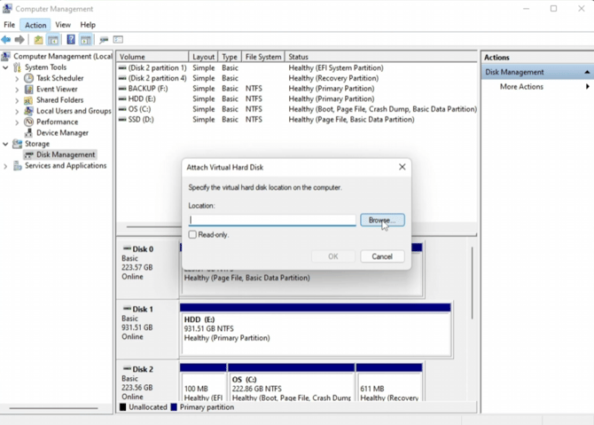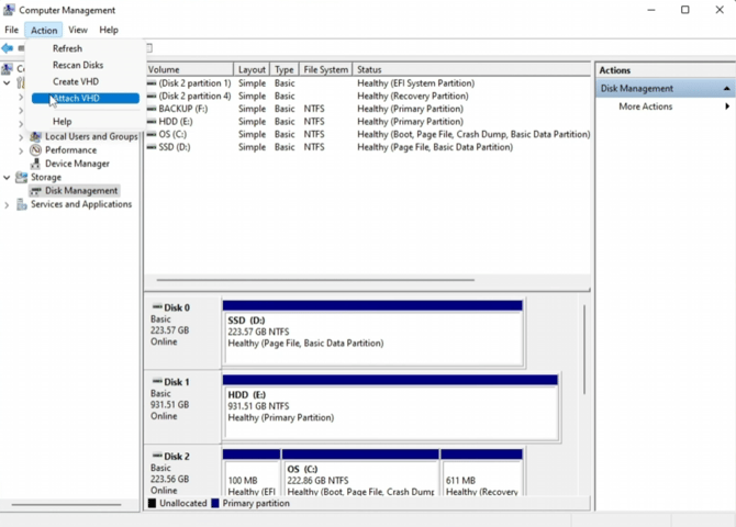 Win + Rand typediskmgmt.msc, then press Enter). - In the Disk Management window, click on Action in the top menu bar, then select Attach VHD.